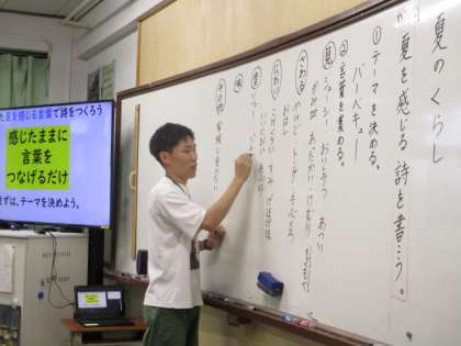 「感じたままに言葉をつなげるだけ」というテーマのもと、夏のくらしから思い浮かぶ言葉をもとにした詩を創りました。例えば、「スイカ」というテーマから思い浮かべる言葉は、音の「シャリシャリ」「プッ」など。「バーベキュー」というテーマならば、見たものの「もくもく」、においの「ゲホゲホ」など。連想して出てきた言葉を紡いでいき、詩という作品に仕上げます。