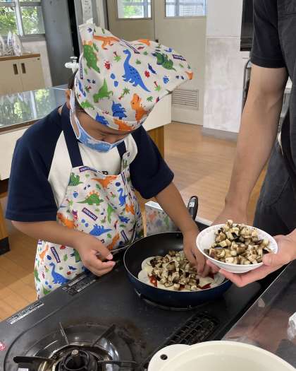 今日は、今年度初めての調理実習を行いました。野菜を切ったりトッピングをしたり、一人ひとりに役割を分担して力を合わせて調理することができました。完成した料理は、みんなで仲良く分け合って食べました。自分たちで作ったご飯は、より美味しく感じたことと思います。自分たちだけでなく、いつもお世話になっている先生方にも食べてもらい、「おいしい」と言ってもらえて、子ども達はとっても嬉しそうでした。
