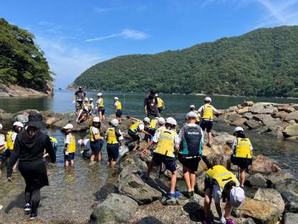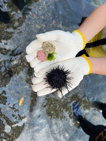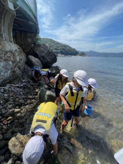 磯観察です。色々な貝やウニ、ヤドカリ、カニ、フナムシに歓声をあげながら観察しています。