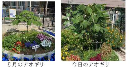3年前の修学旅行で、広島からアオギリの苗をもらってきました。このアオギリは爆心地から1.3kmで被爆した被爆樹木アオギリの種から育った2世のアオギリです。広島と京都、79年前と現在をつなぐ記念のアオギリとして、なかよし時計の横に当時の6年生が植えました。とてもとても小さな苗でしたが、この春から急にぐんぐんと大きくなり、夏の日差しを受けながら日々生長しています。