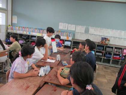 夏休みの自由課題で取り組んだものをお互いに発表しました。実験をしたり、裁縫で作ったり、旅行で見たものをまとめたりとどれも見ていてわくわくするような自由課題でした。自分で課題を決めて、探求する力をこれからの学習にも生かしていってほしいです。