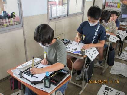 「思いやり」に挑戦しました。1枚の半紙に4文字書くので文字の大きさに気をつけながら書きました。穂先の動きを意識しながら書いているのがとても伝わってきました。