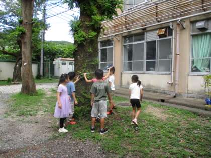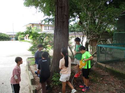 巻き尺やウォーキングメジャーと言った計測器も使い、実際に計測もします。今回は、教室の縦と横の長さ、巻き尺で木の幹の周りを測ったり、運動場の1周を測ったりしました。短く予想していた子が多く、実際はけっこうの長さがあるということを感じられたようです。ところが100mから200m以上の距離はなかなか実感を伴わないものです。1km=1000m。これは理解できるのですが、実際にはどのくらいのものか。「万」や「兆」と同じで、感じにくいものです。道のりで1kmは測れても、1kmの距離を測ることは難しい。そこで、PCの地図サイトを利用しました。距離を測る機能がありますので、明徳小学校から1kmは、だいたい三宅八幡さんくらいでした。「家の人に聞いていた。」という子もいました。道のりは1km以上ありますから、もっとあるような印象ですね。