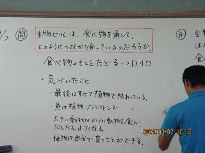 生物同士は食べ物を通して,どのようにしてつながりあっているか考えました。その中で「食物連鎖」というのを新しく学習しました。人が生きられているのもこの食物連鎖が関係しているのですね。
