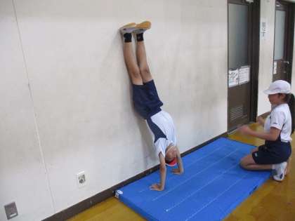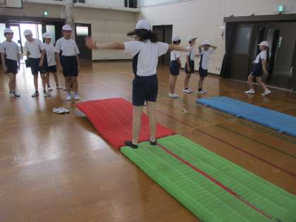 もう少し頑張ればできそうな技を練習するために、バディを組んでお互いに声をかけあって取り組みました。ロイター板を使って坂をつくったり、ウレタンマットを使ったり、様々な場で練習しています。