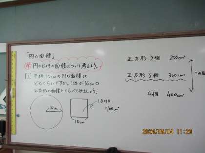 算数は円の面積の単元に入っています。円の面積はどのようにすれば求めることができるという疑問から学習を進めていきました。これまで学習してきた多角形の面積の求め方をもとに考える子もいました。