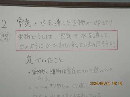生物どうしは空気や水を通してどのように関わっているか考えました。予想をたてて調べ学習をしました。生物には空気も水も欠かせないことが分かりました。