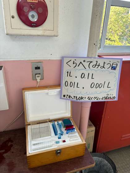 写真に載っているマスは、1L、0.1L、0.01L、0.001Lの4種類のマスです。何杯でいっぱいになるのかを実験し、体感することで10倍、1/10の関係にも気づくことができたようです。