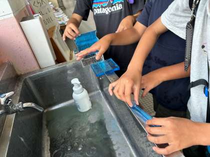 算数科では「小数」の学習を進めています。日常生活でも、靴のサイズや身長、体重などを表す際に、小数を目にする機会は多いことと思います。しかし、4年生では「0.01」や「0.001」など、かなり小さな小数の問題も扱っていきます。子どもたちにとって「0.001」という数は、聞き馴染みもなく、大体どれくらいなのだろう、とピンとこない子も多くいます。そこで、実際に水をマスに入れて、量感をつかんでもらっています。