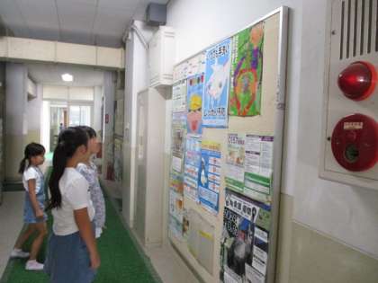 しかし、意外と思いつかないのが、学校内のポスター。子どものお手製のものであったり、見慣れ過ぎてやり過ごしているものもあるようです。そこで、校内を巡ってもらいました。けっこうの数があります。公的なものもあり、ふだんはあまりじっくりと見ていないようでした。イベントの告知だけでなく、啓発のためのポスターもあります。これを機にいろいろと見てくれるとうれしいですね。
