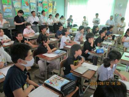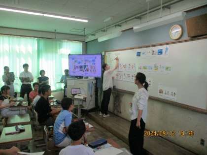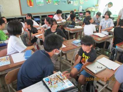 6年2組では6時間目に外国語の学習をしました。多くの先生方に見守られる中で夏休みの過ごし方について話し合いました。英語で伝えることの難しさを友達と知恵を出し合って様々な表現方法を考え合いました。今日の学習を活かして今後対話が盛り上がるといいですね。