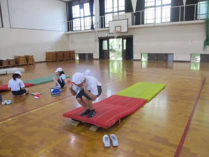 マット運動では、同じ技を練習するペア同士で動画を取ったりアドバイスをして練習しています。できるようになった技が増えている人はどんどん新しい技に挑戦しています。