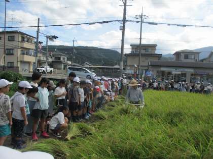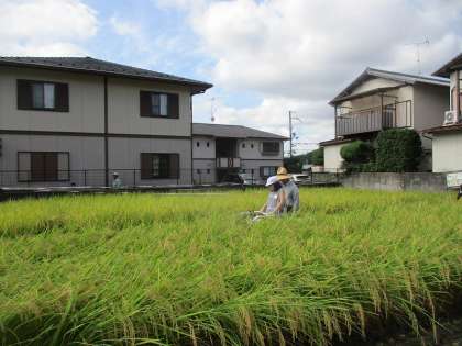 もち米の稲刈り見学をしました。コンバインを使ってどんどん稲を刈っていく様子に驚いている人もたくさんいました。また、コンバインを使う体験をさせていただきました。来週はいよいようるち米をかまを使って稲刈りします。