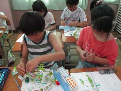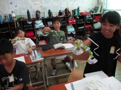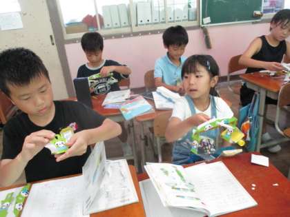 重さの概念と目盛りの読み方を学習する単元です。始めの学習はとても楽しいものです。今の教科書には、切り取って作れる天秤が付いています。どの子も慎重に切り取り、次々にいろいろな物の重さを比べて、思い思いに学習を楽しんでいます。ここまでは直接比較。それに飽き足らぬ子は、数図ブロックという定量の物を取り出して、間接比較を始めました。これは次の時間に学習する1gである1円玉を使う学習につながります。子どもの発想力のすばらしさを目の当たりにしました。