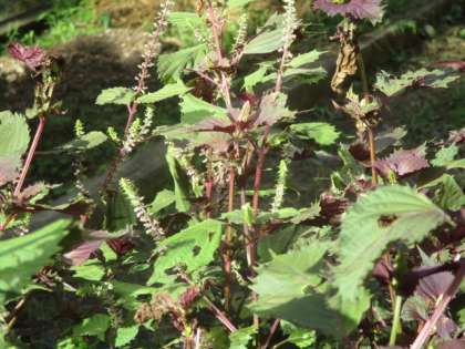 中庭の一か所に集めた赤紫蘇に花芽が出て、とても小さな花が咲いています。いつの頃からかこぼれ種がそこらじゅうで芽吹き、ここ3年以上つながっている中庭の赤紫蘇。植え替えて肥料をやったらやはり大きく育ちました。3年生に「しば漬けの色は何の色?」と尋ねると、多くの子が「赤紫蘇!」と即答してくれました。それが中庭にもあることを知っている子もいて、よく見ているなと感心します。