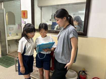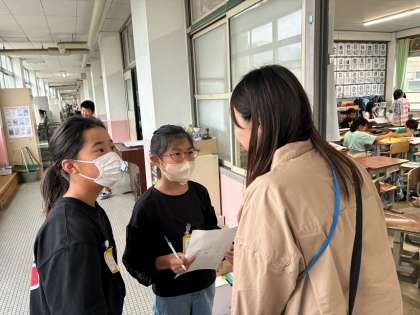 外国語活動の学習では、今回初めて学習した“Do you have~ ?” や、既習の“How many?” という表現を組み合わせながら、先生たちがどんな文房具を持っているのかをインタビューしています。教室に帰って来てから「インタビューできた!」「○○先生めっちゃはさみ持ってはった!」など、英語が伝わった嬉しさや、やりきった充足感が伝わってくるような声が上がっていました。