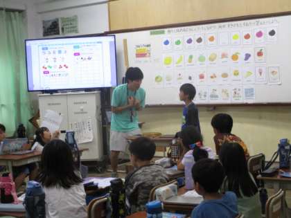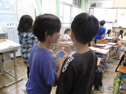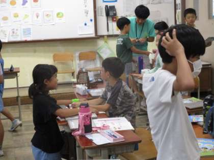 子ども達はそれを駆使して、友だちの好きな色、食べ物、スポーツを聞いています。特に、意外なスポーツが好きな時には盛り上がっていました。“Realy?”という声も上がっていました。相手の返事にさらに言葉を付け加えてやり取りする。この対話が、すてきな関係をつくりあげていくのでしょうね。