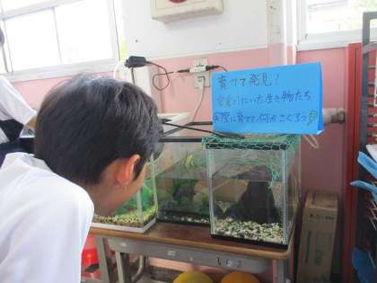 4年生のめいとく学習では、岩倉川の調査で捕まえてきた生き物の正体を探るため、水槽の中で大きくなるまで育てています。
