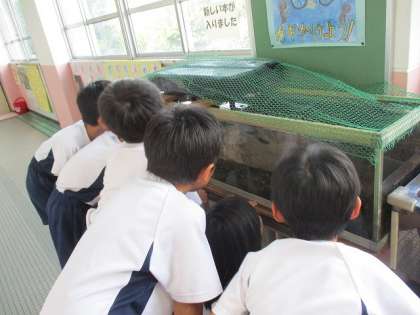 休み時間に「先生!小魚の数が減っています!」との報告。どうやら体が少し大きな魚に食べられてしまったよう。犯人と思われる魚には、更に大きな魚が泳ぐ水槽に引っ越してもらいました。