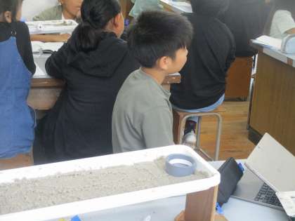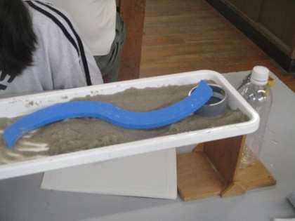 流れる水のはたらきについてモデル実験をしました。