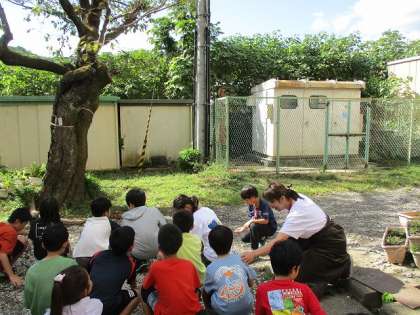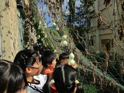 また、『植物を育てよう』の中で育てた瓢箪の成長の様子を観察しました。子どもの中からは「意外に瓢箪って固いやな」と実際に触ってみた感想などを述べていました。