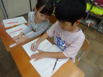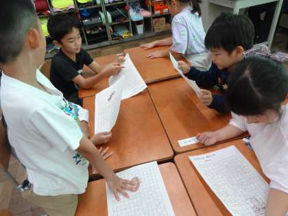 友だちの文を読んでいいところを見つけたり、まちがっているところを伝えあったりしています。