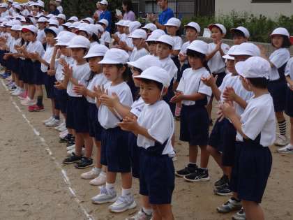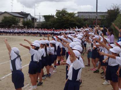 全校練習では、運動場にみんなで並んで準備運動をしたり、応援団の上級生と一緒に声を出して応援したりしました。明日も開会式や閉会式の姿を見てあげてください。