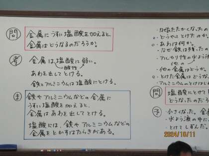 金属にうすい塩酸に加えるとどうなるか考えました。これまで学習した酸性などのことも考えながら予想を立てました。子どもたち同士で考えす姿が良かったです。