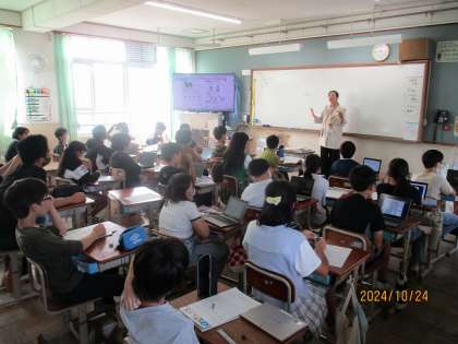 今日も元気よくイングリッシュタイムです。音声を聞いて表現したいことを確かめる。その繰り返しが大切ですね。