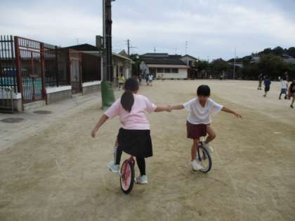 久しぶりに見る光景でした。一輪車は、乗れるようになるまでに相当な練習時間を必要とします。根気が続かなければ、バランスを克服できません。遠くを見て乗るという勇気も必要です。他にも挑戦してみる子は出ないかな。