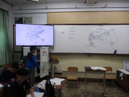 「すがたをかえる大豆」という説明文を学習しました。大豆を利用した食料品を挙げてみると、豆腐や納豆、みそ、しょうゆなど、定番のものは数多く挙げられました。「もやし!」と元気よく言ったのは、予習していた子。もやしはなかなか思い浮かびません。予習の効果が大きいですね。驚いたのは、湯葉を知っていた子がいました。「好きやねん。」とご満悦の表情。これからの鍋シーズン、おいしさも上がりますね。「ナットウキン」から菌類の話にも及び、発酵食品がいろいろ飛び出したりもしました。乳酸菌や麹菌、テンペ菌を知っている子もいました。それらを利用した食品も出てきます。菌類がいるからこの世の有機物は分解され土に戻る、そこから派生して、それでも分解されないプラスチック、そしてマイクロプラスチックの話を知っている子もいました。一つの説明文から環境問題にまで話題が広がるとは思いませんでした。