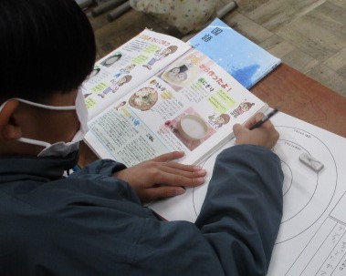一通り説明文の構成の学習をした後は、大豆以外に姿をかえる食料品を調べて、文章にまとめる「食べ物のひみつを教えます」という課題に取り組みます。本やインターネットで調べてことを文章にする学習です。将来的には、探究的な学習にもつながる課題です。ふだんから口にしている食品を調べることに、子ども達は興味津々です。しっかりとした文章にしてまとめられることを期待しています。