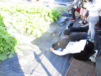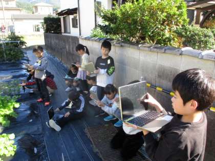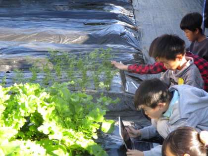その大きさを記録しようと、タブレットPCを持って写真撮影をしました。土際の株元を撮影するには、かなり低い姿勢にならなければなりません。でも、その大きさを記録したい子ども達は、どんどん座り込みます。畝間のシートのおかげで、あまり汚れることもなく撮影できます。日々整備してくださっている畑の先生に感謝です。いい記録をとって、しっかり学習できるようにしていきたいと思います。