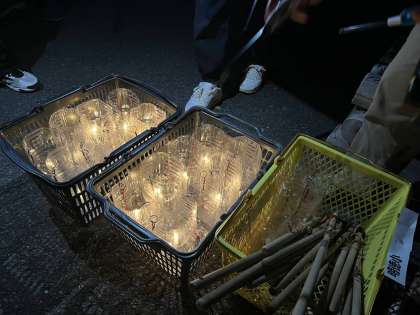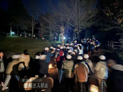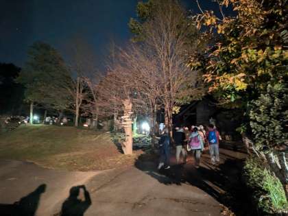 山の家手作りのランタンを持って、ナイトハイクに出発です。暗いのがコワい人もがんばっています。