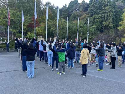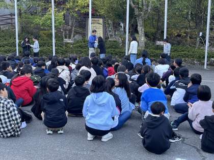 朝の集いを朱雀第八小学校と一緒に行いました。明徳小学校からは「あじなす目標」と「アオギリ」の紹介をしました。また、この3日間にお誕生日を迎えた人たちに、所員さんからプレゼントをいただき、みんなでお祝いをしました。
