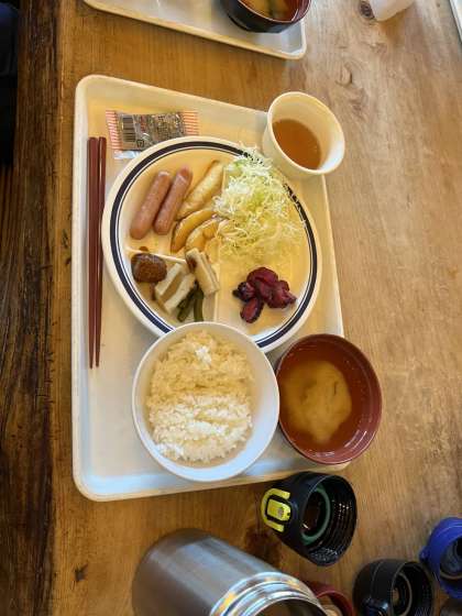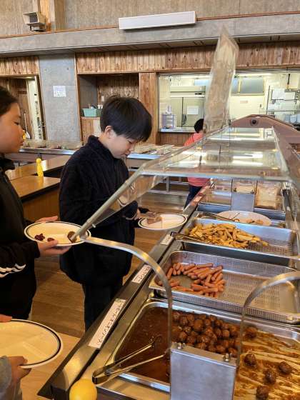 朝食は、ご飯とパンが選べます。ウインナーやミートボール、フライドポテトの朝食に嬉しくなって、ちょっと取りすぎた人もいました。