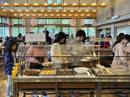 最終日の朝食です。これで食堂での食事は最後です。手慣れた様子で栄養バランスや食べられる量を考えてバイキングのおかずをとることができるようになっています。