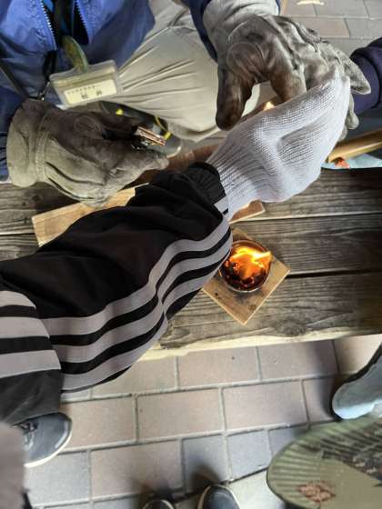 昼食の野外炊事をするための火おこしに挑戦。全ての班が、協力して、火をおこすことができました。