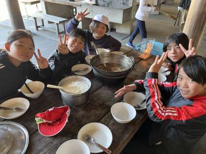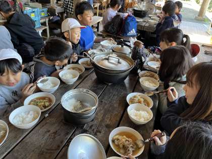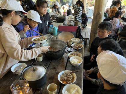 すき焼き風煮とご飯の出来上がりです。自分たちでつくった食事の味は格別です。