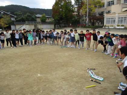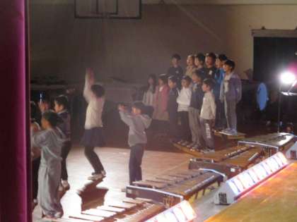 そして音楽グループでは、合奏全体がまとまるように周りの音を聴きながら演奏の仕方をくふうし、一つの音楽を創り上げていきました。体育館で練習し始めて子ども達も気づいたのですが、「早くなってしまう」ということ。合唱も合奏も練習を重ねて覚えられると、なぜか早くなってしまうということに気付きました。どの楽器のリズムに合わせると早くならないか。何度も試しながら、練習を積み重ねました。