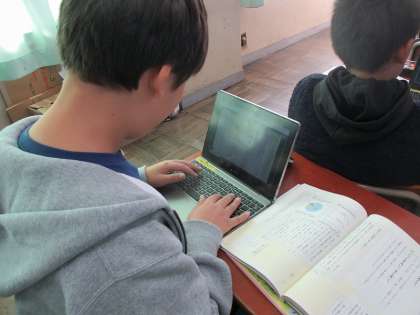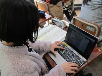 自分の考えに合った表やグラフを用いて、意見文を書き始めています。前回作った文章構成メモをもとに、文末表現に注意しながら書き進めています。説得力を増した文章が書けるように、工夫しています。