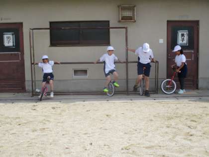 さてその竹馬を始めとした「用具遊び」の単元。ボール、フープ、一輪車が主だったところです。フープを回せるようになって喜んでいる子もけっこういました。大変なのは、一輪車。すぐには乗れません。毎日練習して、早い子で1週間、だいたい2〜3週間、大人だと1カ月以上かかるでしょう。コツをつかむまでが時間を要します。竹馬と同じで、前傾姿勢で前に進むことです。降りる時も前に降りる。こけるときも同様。でも、怖いものです。勇気と根気のいる用具かもしれません。