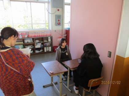 パフォーマンスチャレンジをしています。ALTの先生と1分間英語を使って話します。これまで学習してきた内容を活かすことができたかな?