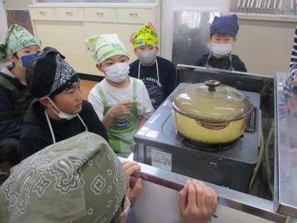 めいとく学習で育ててきたお米を炊き、みそ汁を作りました。ガラスなべでお米が炊き上がる様子を子どもたちは興味津々で見ていました。みそ汁は、にぼしで出汁を取り豆腐とわかめを入れました。自分たちで一から作ったお米の味をかみしめていました。