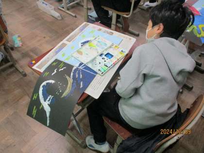 一版多色版画に取り組んでいます。色の付け方に工夫している子もいて面白い作品ができそうです。完成が楽しみです。