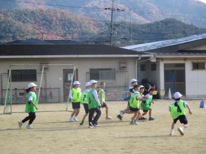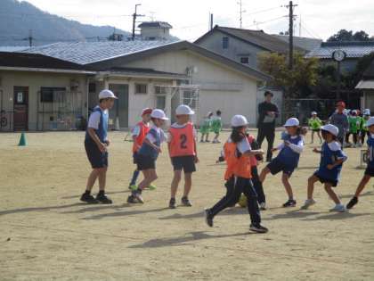 まずパスやドリブルなど基本的なボール操作を学習してから、簡単なゲームを行っています。ゲームを行っていく中では、「どうすれば点が取れるのか」など作戦を考え伝え合うことで、協力して戦う楽しさを体験しています。サッカーの経験がある子が中心になりがちですが、経験のない子も今までのボールを使う競技での経験を活かそうとしています。「エンドボールの時は…、」というような会話も聞かれました。