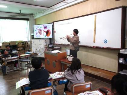 これらの楽器を聴き比べ、「同じような楽器でも音が全然ちがう。」ということに気が付きました。「お姉ちゃんが中学校で吹いている。」という声も上がり、少し身近になったのではないでしょうか。