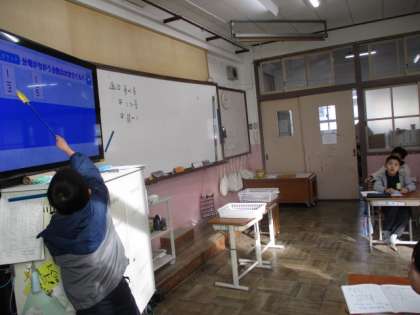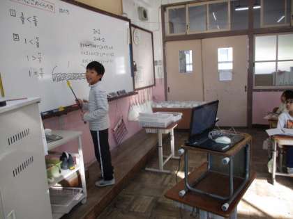 この単元の学習は一応終了しました。子ども達は分数が好きなようです。理由を聞くと「計算が簡単。」ということでした。確かに、分数の加減算では分子同士を加減するだけでよく、教科書に出てくる問題は一桁同士が多く、まずまちがえません。しかし、減法の際に1を分数に変える時にミスをすることがあります。1から5分の3を引くときには、1を5分の5に変えますが、3分の3にしてしまったりします。原因は、分数というものは「1をいくつかに等分したもののいくつ分」だということが十分に理解できていないことにあるようです。