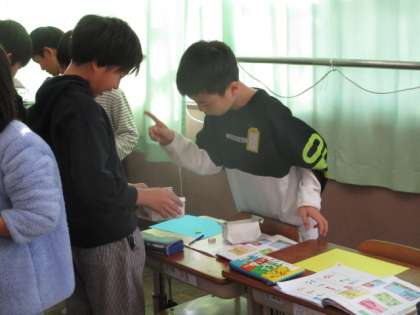 誰かに渡したいカード。これを作るために、“What do you want?”“Blue star, please.”というやり取りをして、目指すパーツを手に入れます。それぞれがパーツの「店員」になり、「お客さん」に尋ねます。お目当てのパーツを手に入れるために、“Red circle, please.”と言いながら、友だちの間を歩いている子もいました。“Here you are.”“Thanks you.”“You are welcome.”と言うことも学習課題なのですが、しっかりと言えているでしょうか。私たちも「店員」として大忙しでしたので、あとで全体に聞くと、「言えた!」と、元気よく返ってきました。どこかで実際に使えるといいですね。