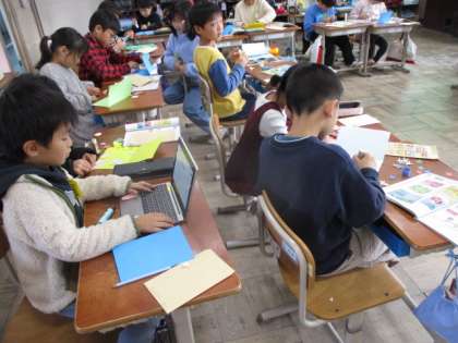 その後はカード作り。集めたパーツを考えていたようにデザインして、誰かにプレゼントするカードを作成します。PCでイラストを検索しながら作っている子もいます。出来上がりをお楽しみに。